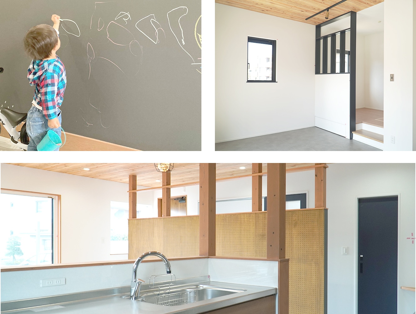 土間の壁一面に張った“黒板クロス”は、お子様が画伯になれる遊び場として早速活躍しているようです!