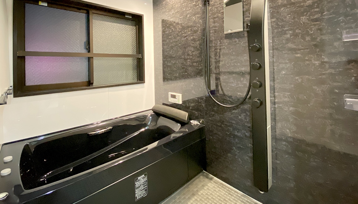 ホテルライクなブラックのユニットバスは、打たせ湯やオーバーヘッドシャワー付き!