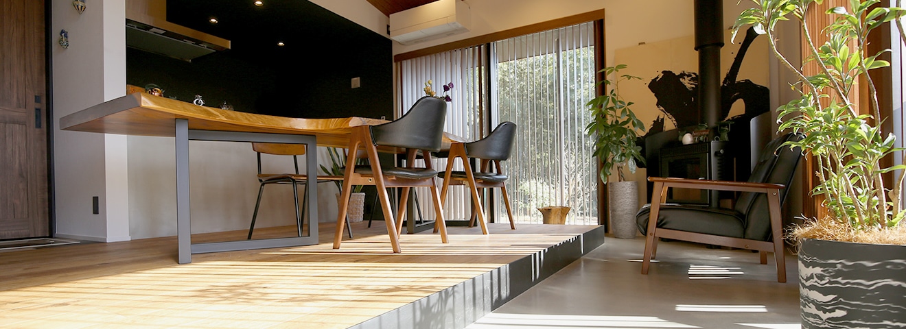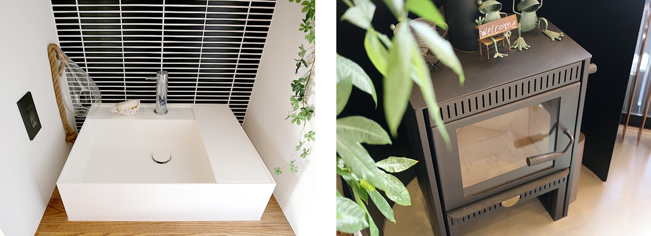 来客の居心地の良さを考え、打ち合わせスペースには土間と薪ストーブを。 日当たりの良い立地を活かして、開口の大きいサッシを採用しました。 事務作業のスペースには、書類を沢山収納したいとのご要望があり、オープンな収納棚を造作。 トイレや造作洗面台は、機能性とデザイン性の両方を意識して選ばれました。